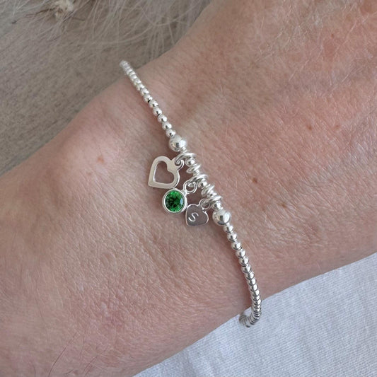 Personalised May Birthstone Bracelet for Birthday, Initial & Gem Crystal Charm in Sterling Silver