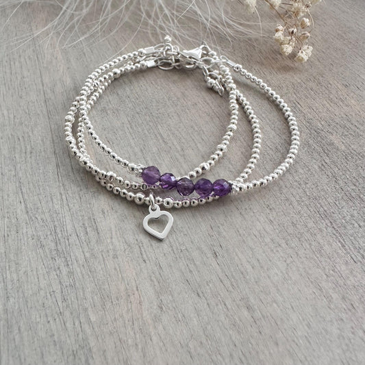 A Dainty February Birthstone Amethyst Bracelet Set, February Stacking Bracelets for Women in Sterling Silver