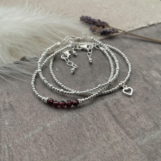 A Dainty January Birthstone Garnet Bracelet Set, January Stacking Bracelets for Women in Sterling Silver