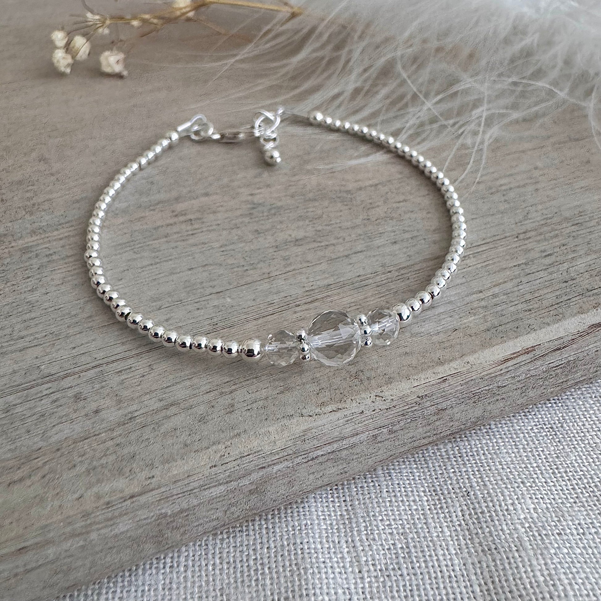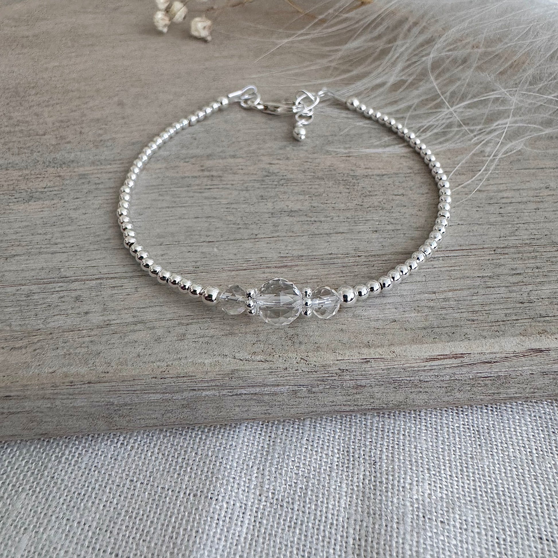 Thin birthstone bracelet made with tiny sterling silver beads in 2mm with feature Rock Quartz Crystal gemstones centralised on the bracelet, the Rock Quartz Crystal gemstones are 4-6mm.