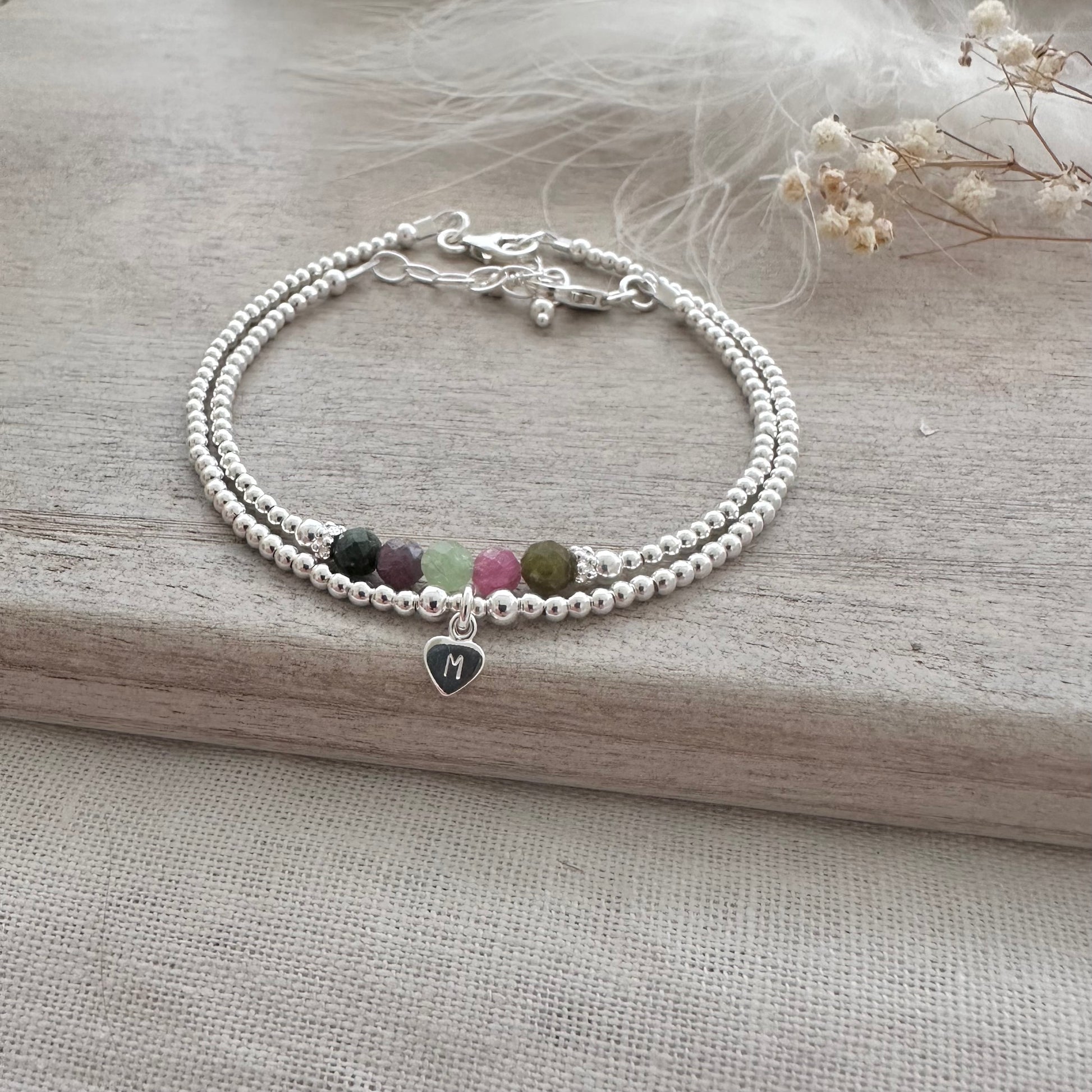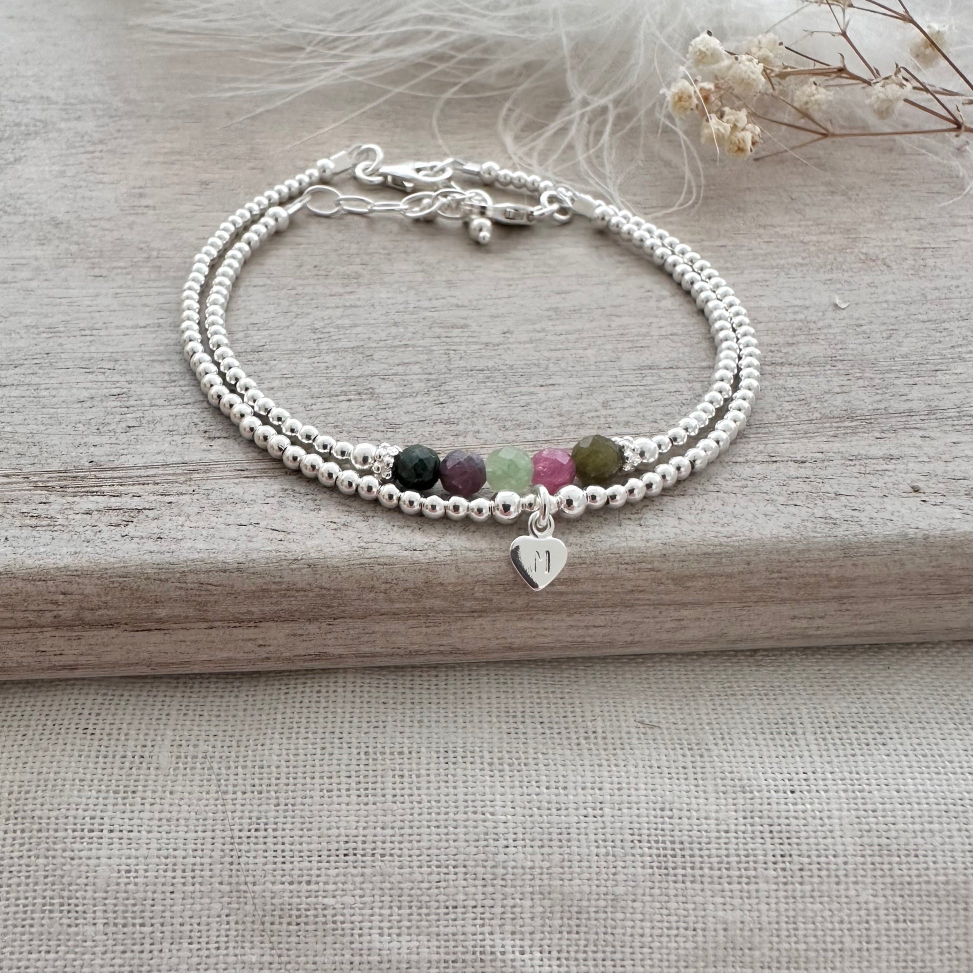 Bracelet one is made with 5 tiny 4mm Tourmaline gemstones and 2mm sterling silver beads with personalised bracelet two, which is an initial bracelet with a tiny 5mm heart and 2mm beads, this makes a wonderful birthstone gift for upcoming birthday.