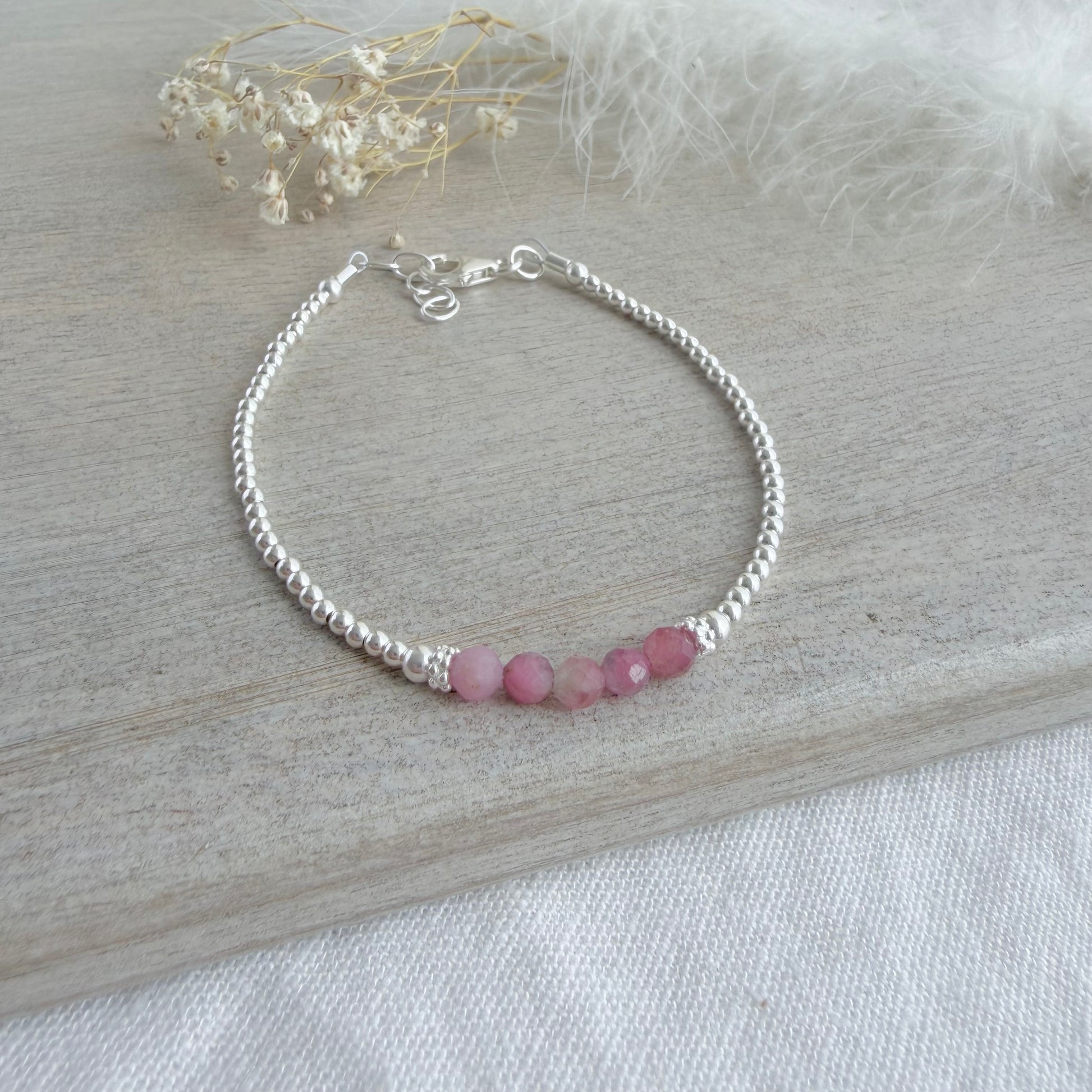 A October Birthstone Bracelet with Pink Tourmaline made with tiny sterling silver beads 2mm in size with tiny round Pink Tourmaline beads centralised on the bracelet, the Tourmalines are 4mm.