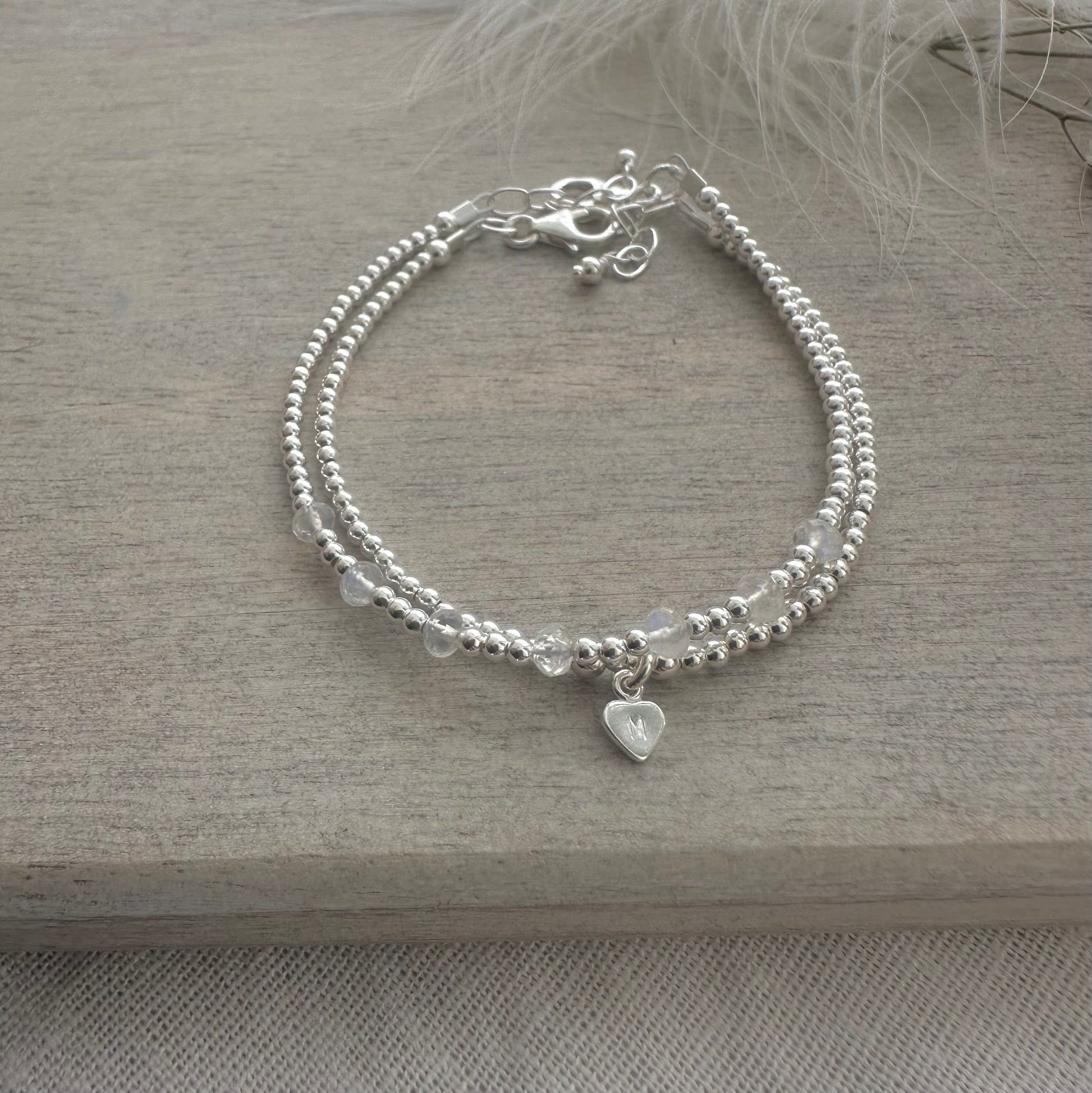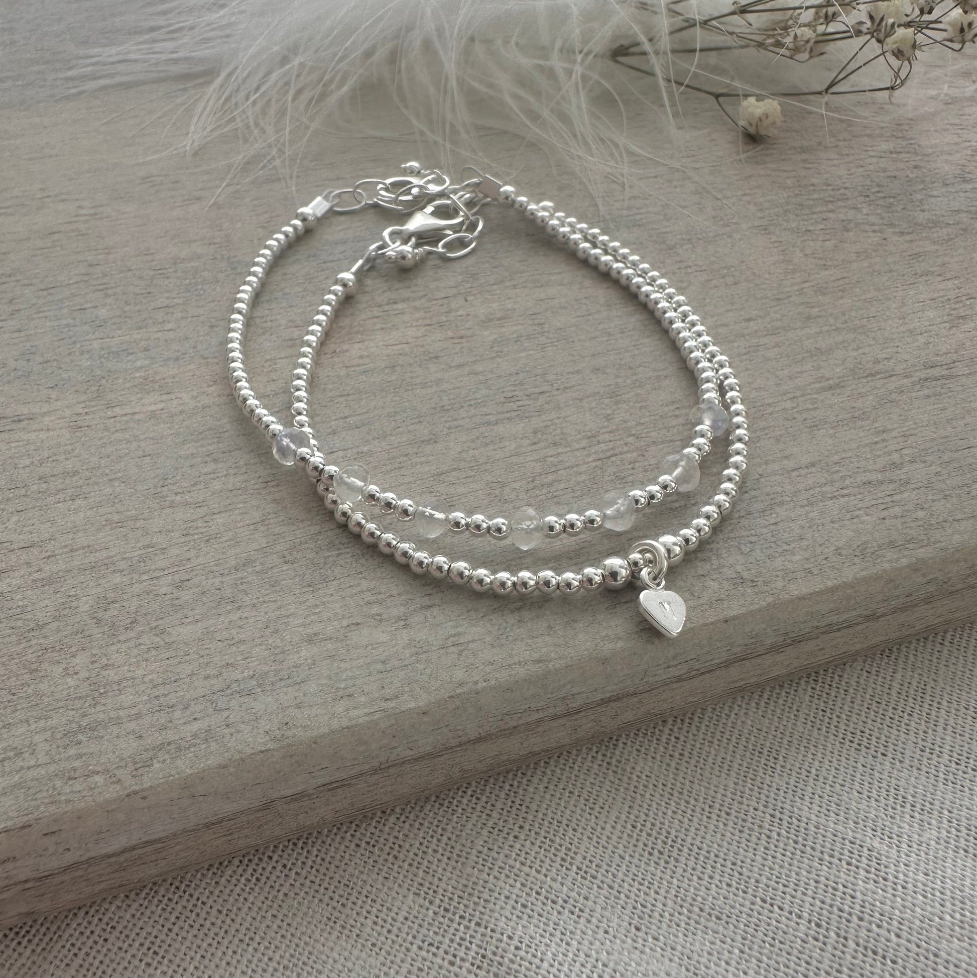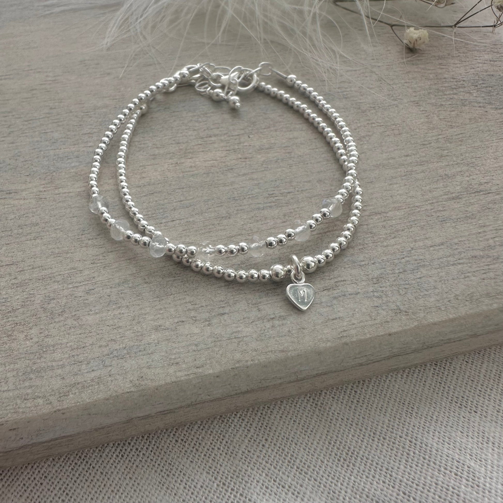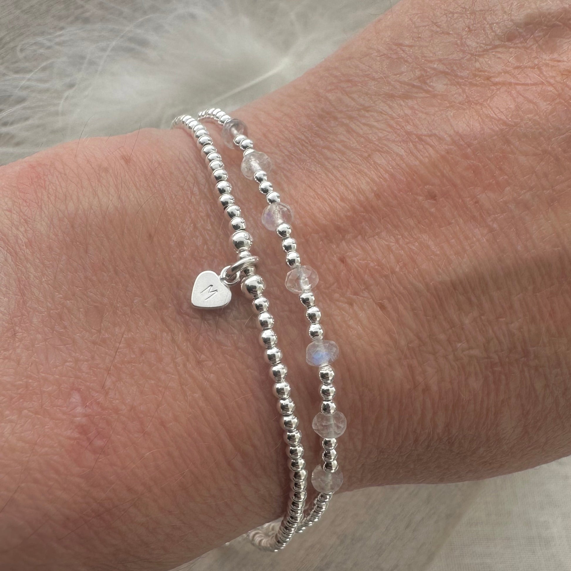 Bracelet one is made with 7 tiny Rainbow Moonstone 4mm gemstones interspersed with 2mm sterling silver beads. Personalised bracelet two, which is an initial bracelet with a 5mm heart and 2mm beads. This makes a wonderful birthstone gift for upcoming birthday.